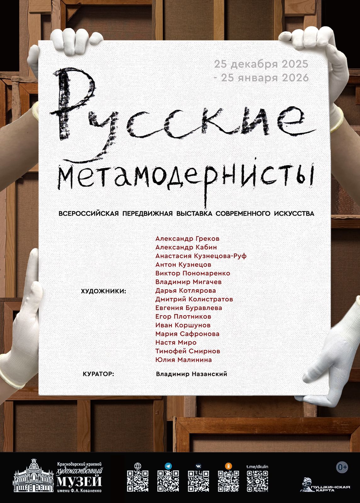 Проект «Русские метамодернисты» объединяет в себе 15 ведущих современных российских художников. Этот проект - манифест поколения художников, родившихся в 80-е годы прошлого века и объединенных общей мировозренческой и культурологической идеей в своем творчестве. «Русские метамодернисты» - это масштабный передвижной проект, экспонирование которого запланировано в государственных музеях по всей России в 2025 и 2026 годах.